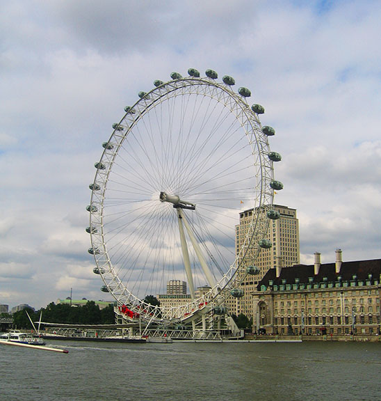 Commonly known as the London Eye, the Millennium Wheel is a 135m (443ft) tall popular tourist attraction on the banks of the River Thames.