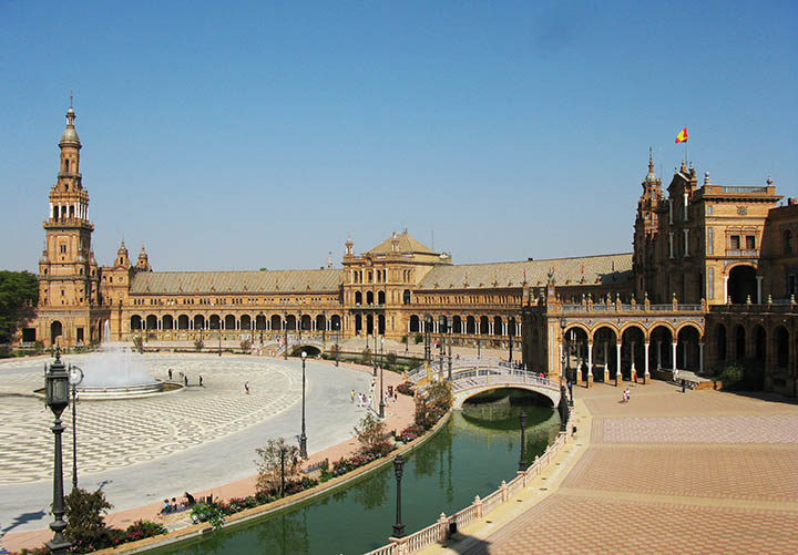 Built as the centrepiece for the 1929 Spanish-American exhibition with its semi-circular arcaded building, the massive Palaçio Español with imposing bell towers on each side of the square, representing the ever present King Ferdinand and Queen Isabella in Spanish architecture, the Plaza de España in Seville is a must-see for its opulence and grandeur. (Notice that along the walls of the canal are 48 alcoves with benches, and colourful azulejos (painted ceramic tiles), one for each province of Spain which are quite beautiful.